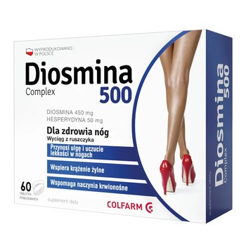 Diosmina 500 Complex - suplement diety zawierający diosminę, hesperydynę, rutynę oraz wyciąg z ruszczyka i witaminę C. Produkt przeznaczony dla osób dorosłych.
