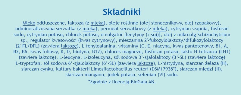 mleko odtłuszczone, laktoza (z mleka), oleje roślinne (olej słonecznikowy, olej rzepakowy), odmineralizowana serwatka (z mleka), permeat serwatkowy (z mleka), cytrynian wapnia, fosforan sodu, cytrynian potasu, chlorek potasu, emulgator [lecytyny z (soi)], olej z mikroalg Schizochytrium sp., regulator kwasowości (kwas cytrynowy), mieszanina 2'-fukozylolaktozy/difukozylolaktozy (2'-FL/DFL) (zawiera laktozę), L-fenyloalanina, witaminy (C, E, niacyna, kwas pantotenowy, B1, A, B2, B6, kwas foliowy, K, D, biotyna, B12), chlorek magnezu, fosforan potasu, lakto-N-tetraoza (LNT) (zawiera laktozę), L-leucyna, L-izoleucyna, sól sodowa 3'-sjalolaktozy (3'-SL) (zawiera laktozę), L-tryptofan, sól sodowa 6'-sjalolaktozy (6'-SL) (zawiera laktozę), L-histydyna, siarczan żelaza (II), siarczan cynku, kultury bakterii Limosilactobacillus reuteri (DSM17938*), siarczan miedzi (II), siarczan manganu, jodek potasu, selenian (VI) sodu *zgodnie z licencją BioGaia AB
