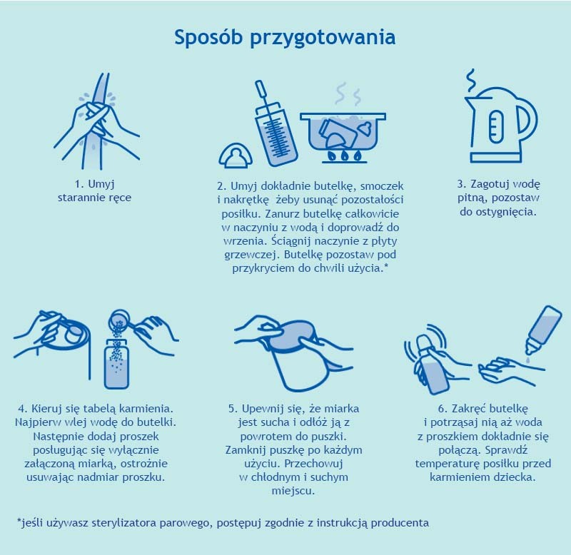Zawsze przed przygotowaniem porcji mleka przegotuj wodę i wyparz butelkę. Pamiętaj, aby przygotowywać mleko zgodnie z instrukcją na opakowaniu i każdorazowo przygotuj tylko jedną porcję mleka, którą od razu podasz dziecku.