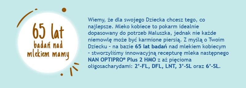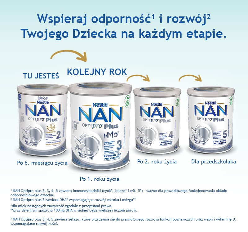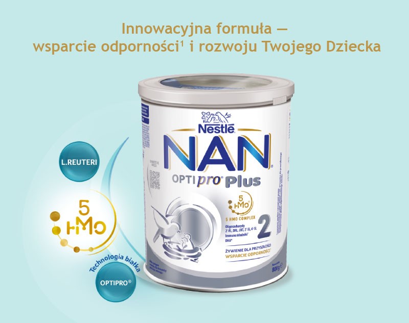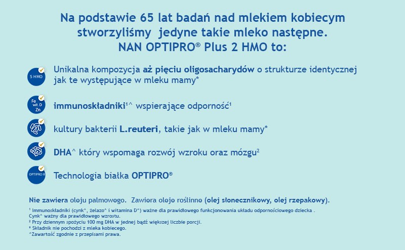Nestle Nan Optipro Plus 2, 5 HMO, mleko następne dla niemowląt powyżej 6. miesiąca – mleko opracowane zostało z myślą o potrzebach żywieniowych niemowląt powyżej 6 miesiąca życia, które z różnych przyczyn nie są karmione piersią lub wymagają dokarmiania. Zawiera kompletną pod względem odżywczym formułę, a także kompleks 5 oligosacharydów: 2'-FL, DFL, LNT, 3'-SL, 6'-SL o strukturze identycznej, jak występujące w mleku matki. Receptura posiada także immunoskładniki oraz niezbędne nienasycony kwas tłuszczowe (DHA) z rodziny omega-3 zgodnie z wymogiem prawnym dotyczącym wszystkich preparatów do początkowego żywienia niemowląt.