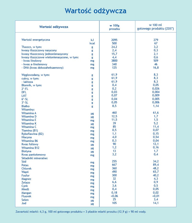 Zawartość miarki: 4,3 g, 100 ml gotowego mleka = 3 płaskie miarki proszku (12,9 g) + 90 ml wody. |