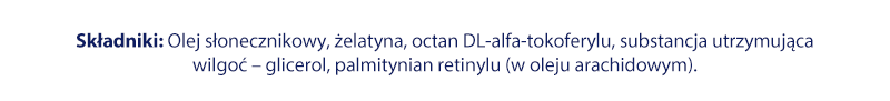 Olej słonecznikowy, żelatyna, octan DL-alfa tokoferylu, substancja utrzymująca wilgoć - glicerol, palmitynian retinylu (w oleju arachidowym).
