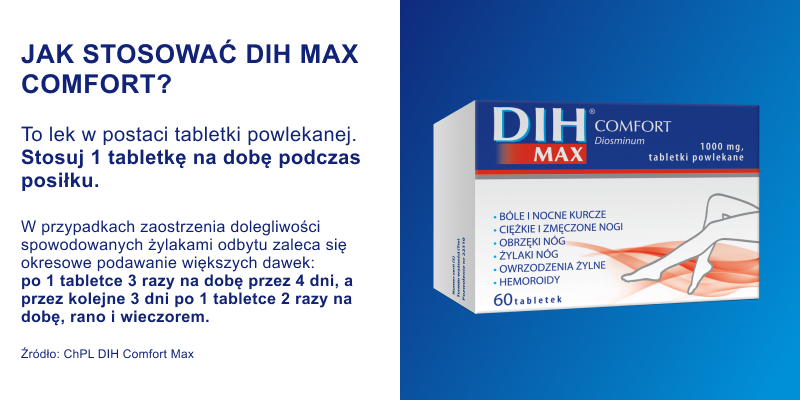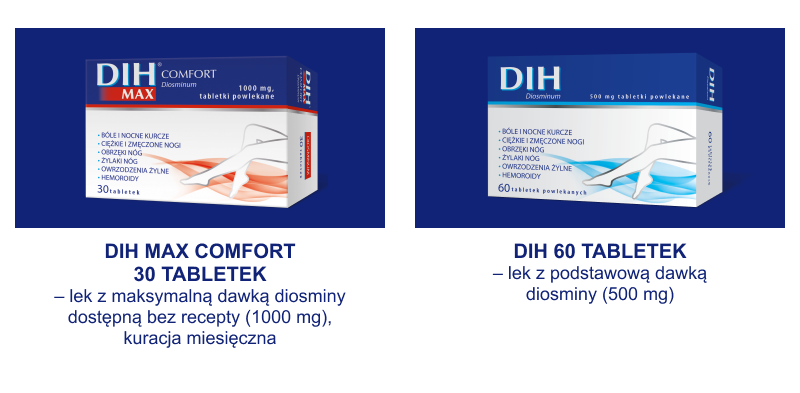 DIH MAX COMFORT, 500 mg, tabletki powlekane. Skład: Jedna tabletka powlekana zawiera 500 mg zmikronizowanej diosminy (Diosminum). Postać farmaceutyczna: tabletka powlekana. Wskazania do stosowania: Objawy przewlekłej niewydolności krążenia żylnego kończyn dolnych: bóle i nocne kurcze nóg, uczucie ciężkości nóg, uczucie zimnych nóg, uczucie ciężkości nóg, zmęczenia, dyskomfortu lub niespokojnych nóg, żylaki kończyn dolnych, owrzodzenia żylne, poszerzenia bardzo drobnych naczyń żylnych, tzw. pajączki naczyniowe i żylaki/żyły siatkowate, obrzęki nóg (opuchlizna/puchnięcie nóg), świąd, parestezje (mrowienie), zaczerwienienie (rumień) lub zasinienie skóry. Objawowe leczenie żylaków odbytu. Monoterapia w początkowych stadiach zaawansowania przewlekłej niewydolności żylnej lub jako uzupełnienie innych terapii we wszystkich stopniach zaawansowania przewlekłej choroby żylnej (C0-C6 wg klasyfikacji CEAP). Podmiot odpowiedzialny: PRZEDSIĘBIORSTWO PRODUKCJI FARMACEUTYCZNEJ HASCO-LEK S.A. 51-131 Wrocław, ul. Żmigrodzka 242E.