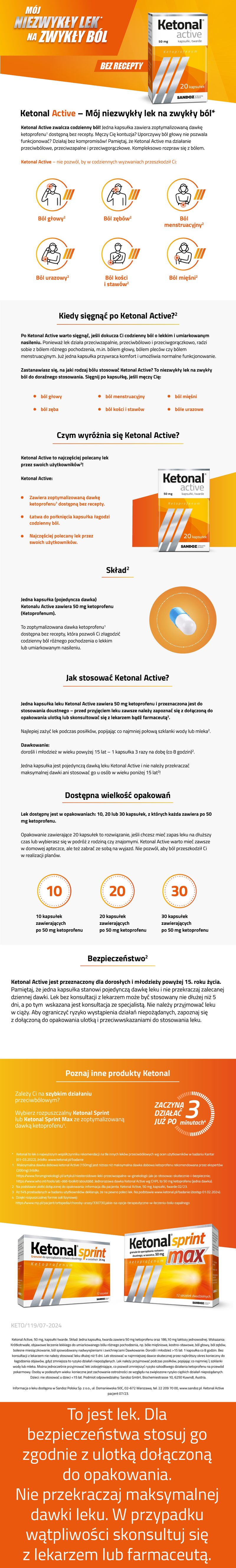 Lek Ketonal Active należy stosować zgodnie z informacją zawartą w ulotce lub według wskazań lekarza, lub farmaceuty. W przypadku wątpliwości należy skontaktować się z lekarzem, lub farmaceutą.