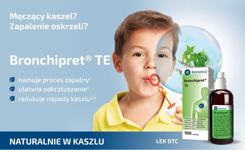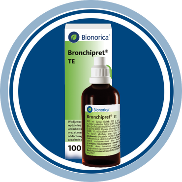 Bronchipret® TE syrop; 100 ml (co odpowiada 112 g) syropu zawiera: 16,8 g płynnego wyciągu z Thymus vulgaris L. i(lub) Thymus zygis L., herba (tymianek) (1:2‑2,5). Rozpuszczalnik ekstrakcyjny: roztwór amoniaku 10% (m/m) / glicerol (85%) (m/m) / etanol 90% (V/V) / woda oczyszczona (1/20/70/109). 1,68 g płynnego wyciągu z Hedera helix L., folium (liść bluszczu) (1:1). Rozpuszczalnik ekstrakcyjny: etanol 70% (V/V). Produkt leczniczy zawiera 7% [V/V] alkoholu. 1 ml syropu zawiera 423 mg maltitolu ciekłego, 28,76 mg sorbitolu (sorbitol zawarty w maltitolu ciekłym). Wskazania terapeutyczne do stosowania: Produkt leczniczy roślinny stosowany w objawach kaszlu z zalegającą wydzieliną, w łagodnych do umiarkowanych infekcjach i stanach zapalnych dróg oddechowych, takich jak ostre zapalenie oskrzeli. Przeciwwskazania: Nadwrażliwość na substancje czynne oraz na inne rośliny z rodziny jasnotowatych (Lamiaceae) oraz araliowatych (Araliaceae), brzozę, bylicę pospolitą, seler, lub na którąkolwiek substancję pomocniczą.