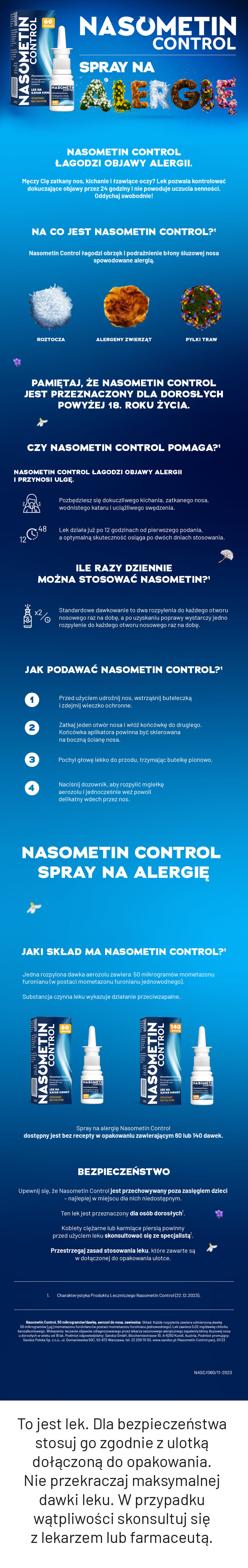 Nasometin Control to aerozol do nosa na alergię, który zawiera substancję czynną mometazonu furoinian - lek z grupy kortykosteroidów, który pomaga łagodzić stan zapalny (obrzęk i podrażnienie błony śluzowej nosa spowodowane katarem siennym) u dorosłych powyżej 18 roku życia. Nasomentin jest dostępny bez recepty.