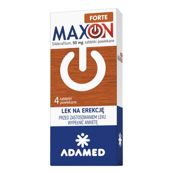 Maxon Forte (Sildenafilum). Skład i postać: 1 tabletka powlekana zawiera 50 mg syldenafilu w postaci syldenafilu cytrynianu. Wskazania: Produkt leczniczy MAXON FORTE jest wskazany do stosowania u dorosłych mężczyzn zaburzeniami erekcji, czyli niezdolnością uzyskania lub utrzymania erekcji prącia wystarczającej do odbycia stosunku płciowego. W celu skutecznego działania produktu leczniczego MAXON FORTE niezbędna jest stymulacja seksualna. Pozwolenie na dopuszczenie do obrotu dla Maxon Forte 08510 wydane przez MZ. Lek wydawany bez recepty. ChPL: 2022.09.01. Podmiot odpowiedzialny: Adamed Pharma S.A.