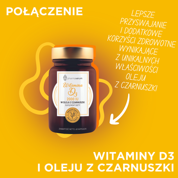 Witamina D3 2000 IU w oleju z czarnuszki - suplement diety z cholekalcyferolem rozpuszczonym w oleju z czarnuszki. Produkt przeznaczony dla osób dorosłych. Nie zawiera glutenu.