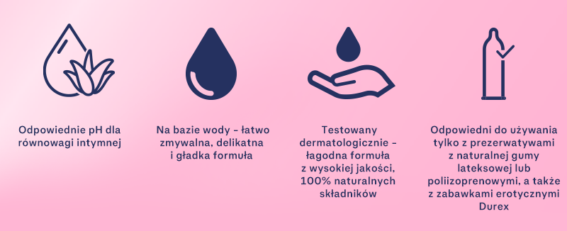 Odpowiedni do używania tylko z prezerwatywami z naturalnej gumy lateksowej lub nielateksowymi poliizoprenowymi prezerwatywami, a także z zabawkami erotycznymi Durex. Kilka ostrzeżeń: Używaj zgodnie z przeznaczeniem. Nie jest to środek antykoncepcyjny oraz nie zawiera środka plemnikobójczego. Może spowalniać ruchliwość plemników. Unikaj kontaktu z oczami, uszkodzoną skórą lub ranami. Zaprzestań użycia, jeśli wystąpi podrażnienie. Skonsultuj się z lekarzem, jeśli podrażnienie nie ustanie, doświadczasz ciągłej suchości pochwy, jesteś w ciąży lub karmisz piersią. Przechowuj w miejscu niedostępnym dla dzieci. Nie używaj z prezerwatywami poliuretanowymi. Zużyj w ciągu 6 miesięcy od otwarcia. Zużytą butelkę lub przeterminowany produkt wyrzuć do kosza. Nie używać w przypadku uszkodzonego opakowania. Chronić przed wilgocią. Chronić przed promieniowaniem słonecznym. Przechowuj w chłodnym miejscu. Wvrób medyczny. Przed użyciem sprawdź instrukcję używania.