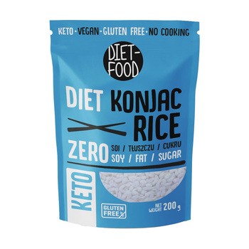 Diet-Food, makaron Shirataki Konjac, ryż powstał na bazie rozpuszczalnego w wodzie błonnika z korzenia rośliny Konnyak. Produkt nie zawiera glutenu, soi oraz jajek. Jest odpowiedni dla osób na diecie wegańskiej, wegetariańskiej i ketogenicznej.