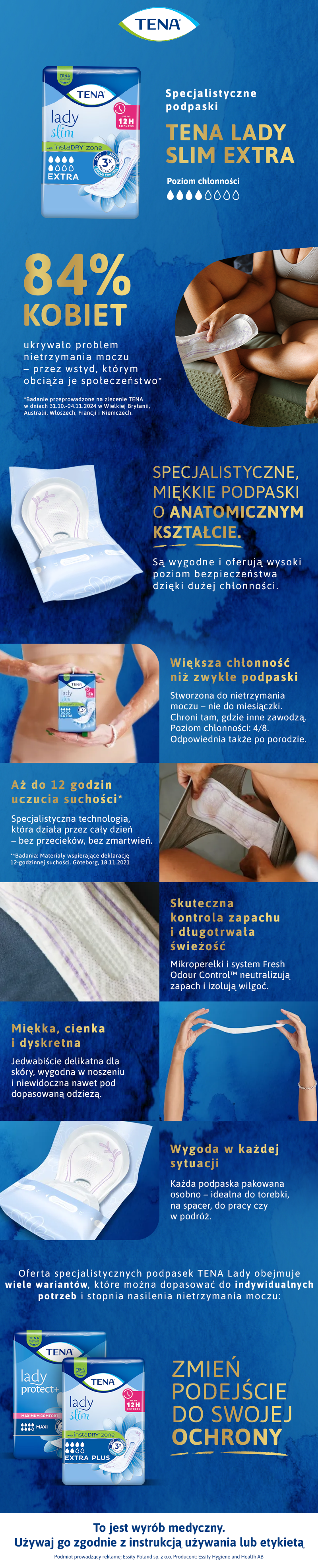 Tena Lady Slim to wyrób medyczny w postaci podpasek na nietrzymanie moczu przeznaczony dla kobiet do stosowania przy lekkim i średnim stopniu nietrzymania moczu. Dzięki specjalnej strefie InstaDRY™ wkładki bardzo szybko pochłaniają płyn, natomiast chłonny wkład zamyka go głęboko wewnątrz podpaski. Produkt pomaga chronić przed przeciekaniem, nieprzyjemną wonią i wilgocią, zaś elastyczne boki pozwalają na dopasowanie się do kształtu ciała.