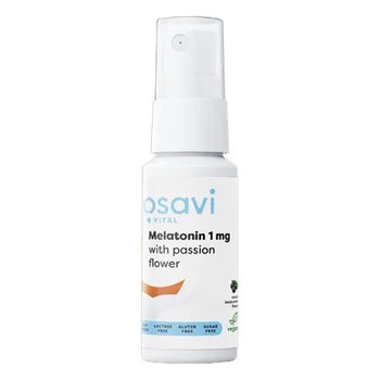 Osavi Melatonina z passiflorą – suplement diety w postaci doustnego sprayu, który zawiera melatoninę, passiflorę oraz melisę. Produkt przeznaczony dla osób powyżej 12. roku życia. Odpowiedni dla wegetarian i wegan. Bez glutenu, bez laktozy, bez cukru, bez soi, bez GMO. Keto.