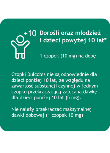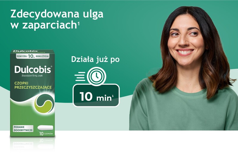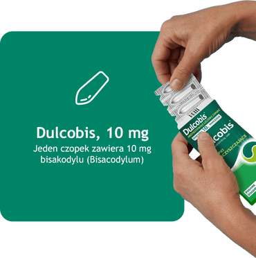 Dulcobis, czopki, 10 mg bisakodylu. Wskazania: Krótkotrwałe, objawowe leczenie zaparć u dorosłych i dzieci powyżej 10 lat. Dorośli: przygotowanie do badań diagnostycznych, leczenie przed i pooperacyjne, stany wymagające ułatwienia defekacji. {ChPL 01.2025} Podmiot odpowiedzialny: Opella Heathcare Poland Sp. z o.o.; grupa Sanofi