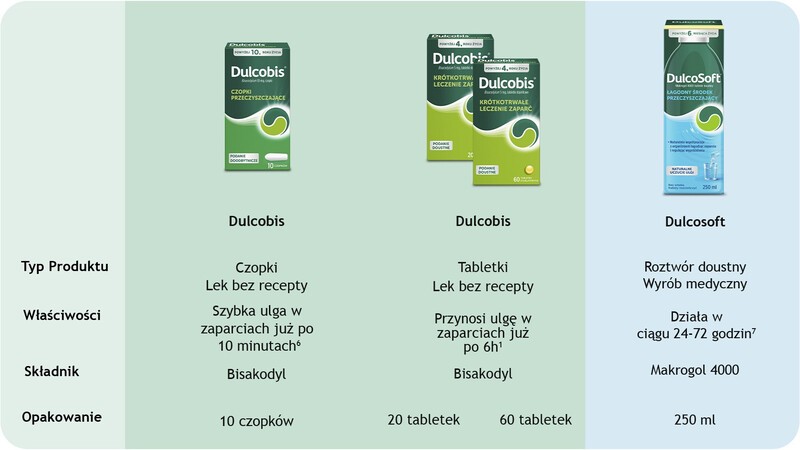 1.Dulcobis, 10 mg, czopki ChPL 01.2025.; Dulcobis 5 mg tabletki ChPL, 01.2025. Działanie przeczyszczające czopków występuje średnio po 20 minutach od podania (10-30 minut) i jest szybsze od działania bisakodylu w formie tabletek dojelitowych (6‑12 h).