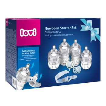 Canpol Lovi, zestaw wyprawkowy, Baby Shower, Boy to doskonały prezent dla przyszłej mamy jako element wyprawki dla niemowlaka. Zawiera akcesoria niezbędne już od pierwszych dni życia, w tym: 4 szt. butelek Lovi Medical z systemem antykolkowym (2 x 150 ml, 2 x 250 ml), 4 dynamiczne smoczki Lovi, które nie zaburzają odruchu ssania (2 szt 0m+, 2 szt. 3m+), tasiemka do smoczka, dzięki której smoczek zawsze jest w zasięgu ręki.