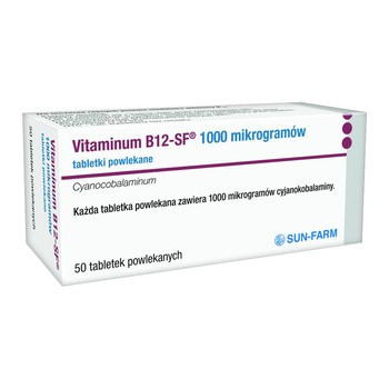Lek Vitaminum B12-SF zawiera w składzie witaminę B12 w postaci cyjanokobalaminy, ma postać tabletek powlekanych. Lek Vitaminum B12-SF jest stosowany u osób dorosłych w leczeniu niedoborów witaminy B12, który może prowadzić do różnych form niedokrwistości.