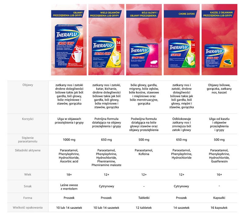 Kiedy nie stosować leku Theraflu Max Grip: w przypadku uczulenia na paracetamol, fenylefrynę, kwas askorbowy lub na którąkolwiek z pozostałych składników tego leku; u osób przyjmujących inhibitory MAO ani w ciągu 14 dni od zakończenia takimi lekami; u osób przyjmujących zydowudynę; u osób ze stwierdzoną chorobą alkoholową wątroby, jaskrą zamykającego się kąta, niewydolności wątroby, ciężką niewydolnością nerek, nadczynnością tarczycy, cukrzycą, nadciśnieniem tętniczym, guzem chromochłonnym nadnerczy; u osób przyjmujących TLPD (trójpierścieniowe leki przeciwdepresyjne); u osób przyjmujących blokery receptorów beta-adrenergicznych.