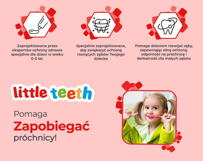 - Zapewnia delikatną pielęgnację i ochronę przed próchnica pierwszych zębów.