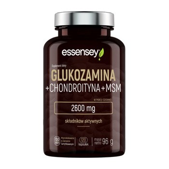 Essensey Glukozamina + Chondroityna + MSM - to suplement diety w postaci kapsułek, który zawiera siarczan glukozaminy, siarczan chondroityny oraz metylosulfonylometan. Produkt dla dorosłych.