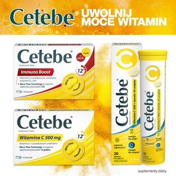 Cetebe Immuno Boost - to suplement diety w formie kapsułek, który zawiera w swoim składzie witaminę C, D oraz cynk. Produkt przeznaczony dla dorosłych.