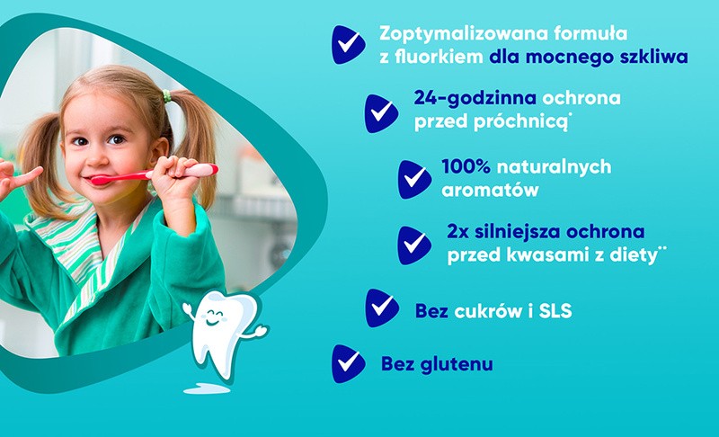 Dla dzieci w wieku 6–12 lat, do codziennego stosowania w higienie jamy ustnej.