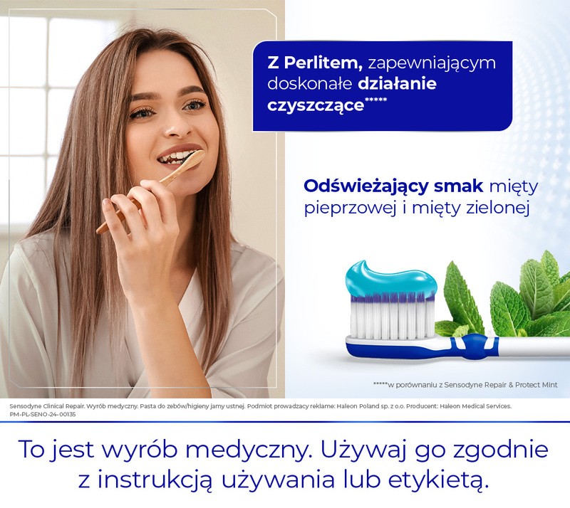 Wyrób medyczny w postaci pasty do zębów. Formuła produktu stworzona specjalnie z myślą o osobach z nadwrażliwością zębów, które pragną przywrócić swoim zębom naturalną biel. Dzięki innowacyjnej technologii NovaMin, pasta zaczyna naprawiać wrażliwe obszary już po 2 minutach szczotkowania, tworząc ochronną warstwę na odsłoniętej zębinie. Dodatkowo, zawartość perlitu oraz wyższy poziom krzemionki zapewniają skuteczne działanie wybielające, usuwając przebarwienia i przywracając zębom ich naturalny blask.