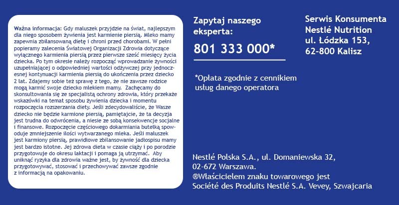 Nieodpowiednie przygotowanie i przechowywanie może stanowić zagrożenie dla zdrowia dziecka. Nie przechowuj resztek mleka - niezjedzoną porcję mleka należy od razu wylać. Produkt należy podawać dziecku w pozycji siedzącej, pod kontrolą osoby dorosłej. Dziecko pozostawione bez opieki może się zakrztusić.
