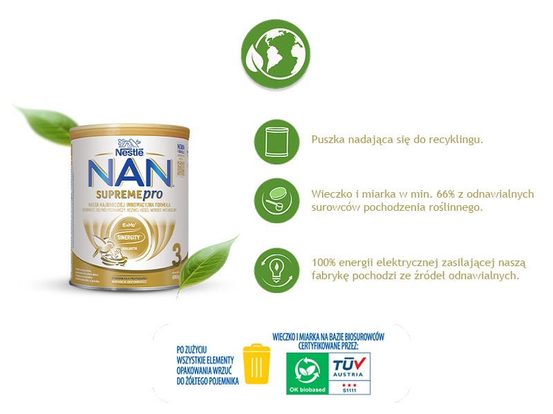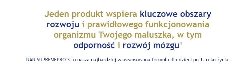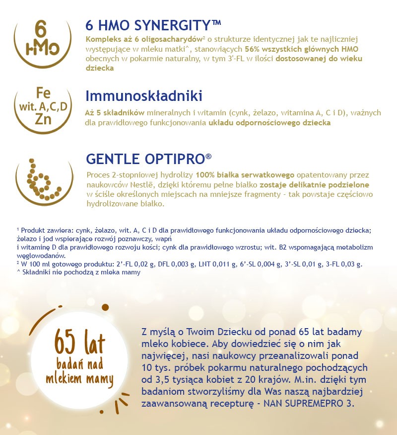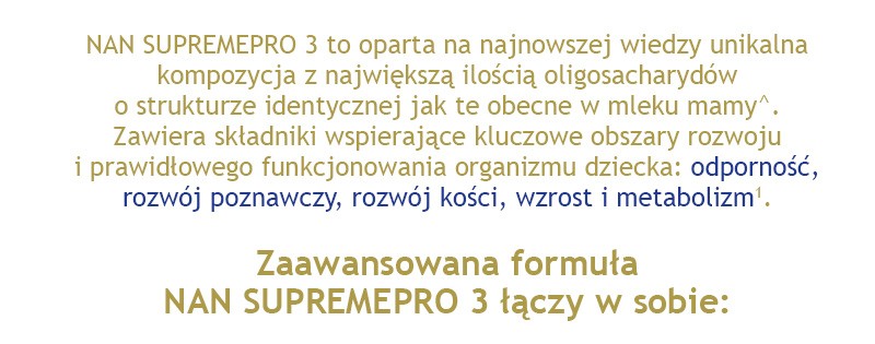 Nestle Nan Supremepro 3, produkt na bazie mleka po 1. roku życia – formuła zawiera kompozycję 6 oligosacharydów - 6 HMO SINERGITY (2'-FL, DFL, LNT, 3'-SL, 6’-SL, 3-FL) oraz immunoskładniki: cynk, żelazo, witaminy: A, C, D. Powstała z zastosowaniem unikalnej technologii GENTLE OPTIPRO, 2-stopniowej hydrolizy.