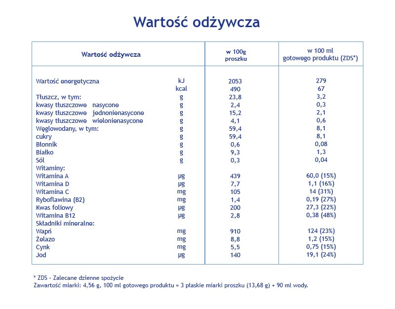 Podana na opakowaniu wielkość porcji jest średnią, jaką zjada dziecko w danym wieku zależnie od indywidualnych potrzeb. Różnice mogą dotyczyć również liczby posiłków. Zawsze konsultuj ilość posiłków z lekarzem prowadzącym. Podczas przygotowywania mleka należy kierować się aktualnymi instrukcjami zamieszczonymi na opakowaniu. Aby utrzymać odpowiednia ilość żywych kultur bakterii, przegotowana woda powinna być ostudzona do temperatury zbliżonej do temperatury ciała (ok. 37°C) przed dodaniem proszku.
