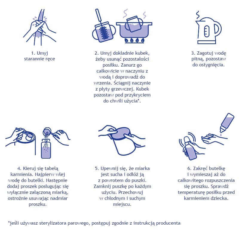 Starannie umyj ręce, a następnie dokładnie oczyść kubek, aby usunąć resztki posiłku. Zanurz go w naczyniu z wodą, doprowadź do wrzenia, a następnie zdejmij naczynie z płyty grzewczej i pozostaw kubek pod przykryciem do momentu użycia. Jeśli korzystasz ze sterylizatora parowego, postępuj zgodnie z instrukcją producenta. Zagotuj wodę pitną i pozwól jej ostygnąć. Kierując się tabelą karmienia, najpierw wlej odpowiednią ilość wody do kubka, a następnie dodaj odmierzoną ilość proszku, używając wyłącznie załączonej miarki i delikatnie usuwając jej nadmiar. Upewnij się, że miarka jest sucha i odłóż ją do puszki, szczelnie zamykając opakowanie po każdym użyciu. Przechowuj produkt w chłodnym i suchym miejscu. Dokładnie wymieszaj zawartość kubka, aż proszek całkowicie się rozpuści. Przed podaniem dziecku upewnij się, że temperatura posiłku jest odpowiednia.