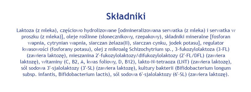 laktoza (z mleka), częściowo hydrolizowane [odmineralizowana serwatka (z mleka) i serwatka w proszku (z mleka)], oleje roślinne (słonecznikowy, rzepakowy), składniki mineralne [fosforan wapnia, cytrynian wapnia, siarczan żelaza(II), siarczan cynku, jodek potasu], regulator kwasowości (fosforany potasu), olej z mikroalg Schizochytrium sp., 3-fukozylolaktoza (3-FL) (zawiera laktozę), mieszanina 2'-fukozylolaktozy/difukozylolaktozy (2'-FL/DFL) (zawiera laktozę), witaminy (C, B2, A, kwas foliowy, D, B12), lakto-N-tetraoza (LNT) (zawiera laktozę), sól sodowa 3'-sjalolaktozy (3'-SL) (zawiera laktozę), kultury bakterii (Bidobacterium longum subsp. infantis, Bidobacterium lactis), sól sodowa 6'-sjalolaktozy (6'-SL) (zawiera laktozę).