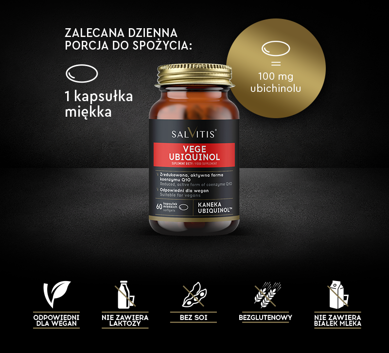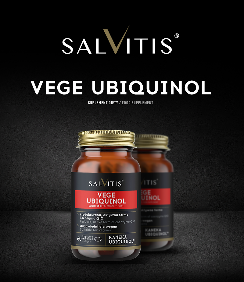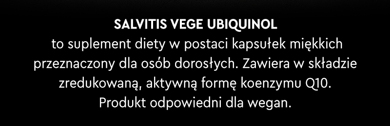 Salvitis Vege Ubiquinol - to suplement diety w formie kapsułek, który w swoim składzie zawiera ubichinol. Produkt przeznaczony dla osób dorosłych.