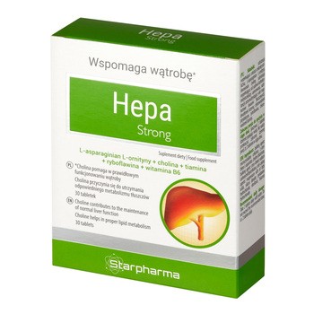 Starpharma Hepa Strong - to suplement diety w formie tabletek, który w swoim składzie zawiera L-asparaginian L-ornityny, cholinę witaminę B6, ryboflawinę i tiaminę. Produkt przeznaczony dla dorosłych.