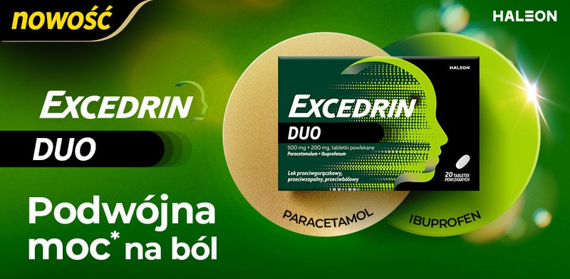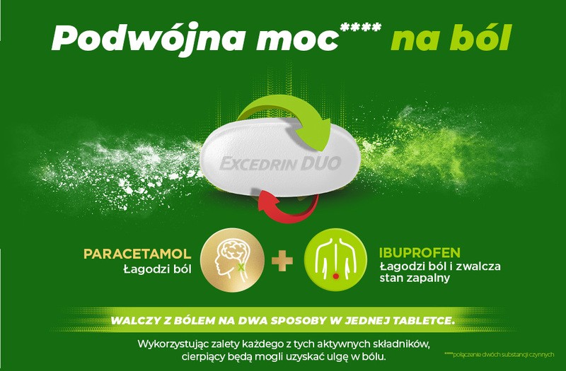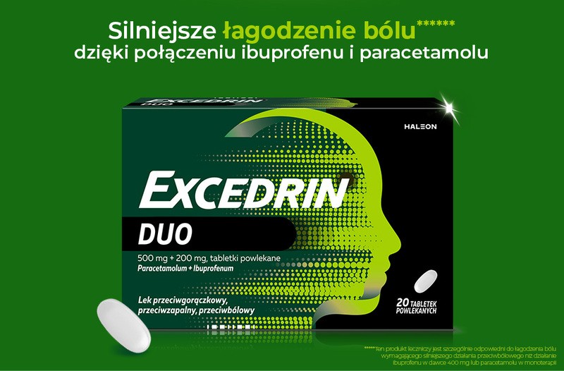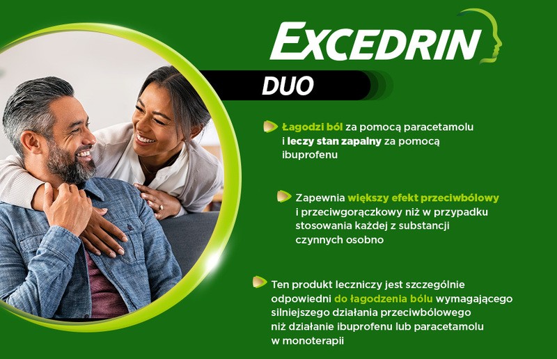 Excedrin Duo to lek łączący paracetamol i ibuprofen, przeznaczony do krótkotrwałego leczenia bólu o nasileniu łagodnym do umiarkowanego, takiego jak migrena, bóle głowy, pleców, menstruacyjne, zębów, bóle reumatyczne i mięśniowe, bóle związane z zapaleniem stawów (o nasileniu innym niż ciężkie), a także objawy przeziębienia i grypy, ból gardła oraz gorączka.