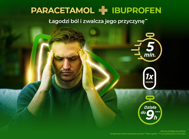 Każda tabletka powlekana zawiera 500 mg paracetamolu i 200 mg ibuprofenu.