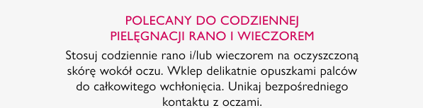 Stosuj codziennie rano i/lub wieczorem. Niewielką ilość kremu delikatnie wklep opuszkami palców w skórę wokół oczu, unikając bezpośredniego kontaktu z oczami.