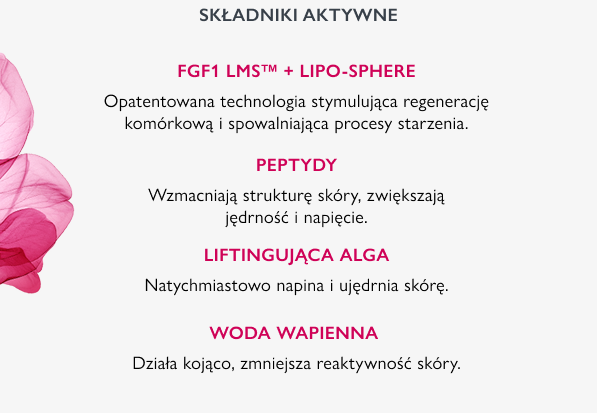 Składniki aktywne: woda wapienna, hexapeptyd, liftingująca alga, LIPO-SPHERE FGF1 LMS.