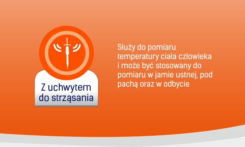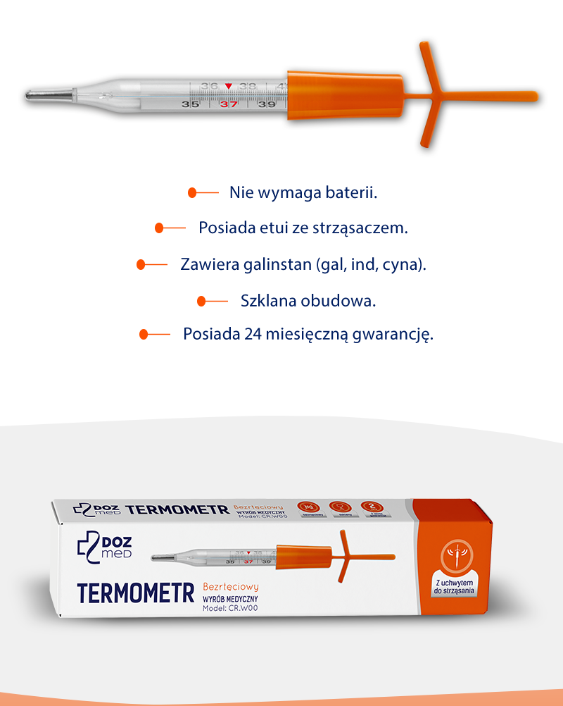 Wyrób medyczny w postaci szklanego termometru przeznaczonego do pomiaru temperatury u ludzi. Posiada specjalny uchwyt ułatwiający strzepywanie.