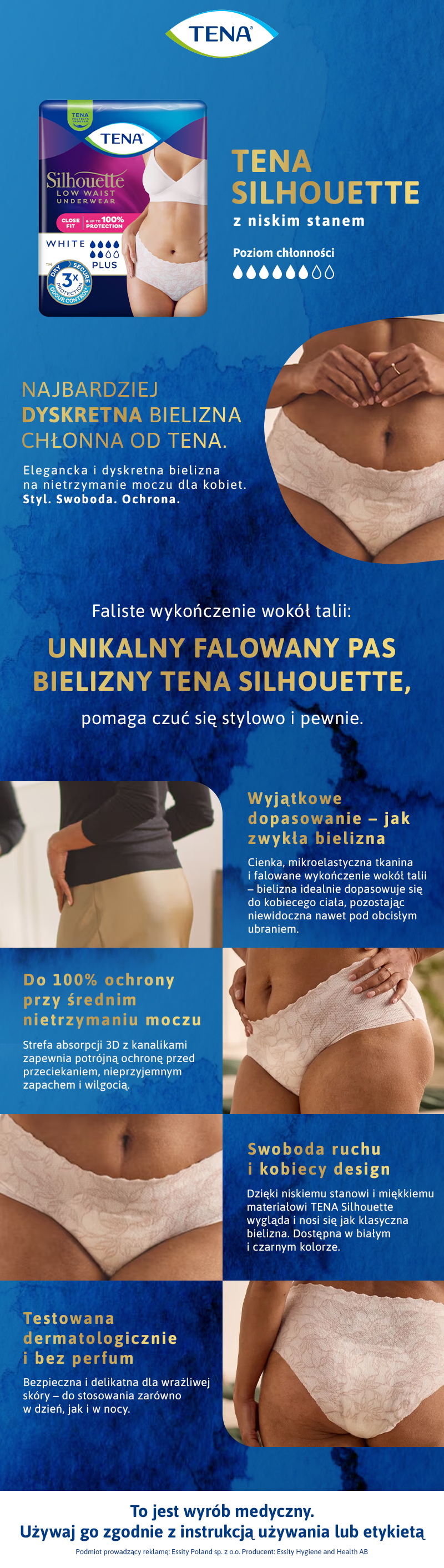 Tena Silhouette Plus charakteryzuje się wyjątkową dyskrecją. Z wyglądu przypomina zwykłą bieliznę. Materiał z którego została wykonana jest oddychający i komfortowy. Jest bezpieczny i przyjazny dla skóry. Krój pomaga utrzymać bieliznę się na miejscu podczas stosowania.