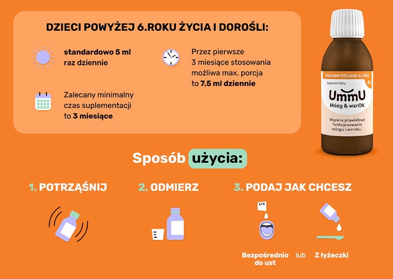 UmmU Mózg & wzrOK 6+ - to suplement diety w postaci płynu, który zawiera EPA, DHA, GLA oraz fosfatydyloserynę sojową. Produkt przeznaczony dla dzieci powyżej 6. roku życia i dorosłych.