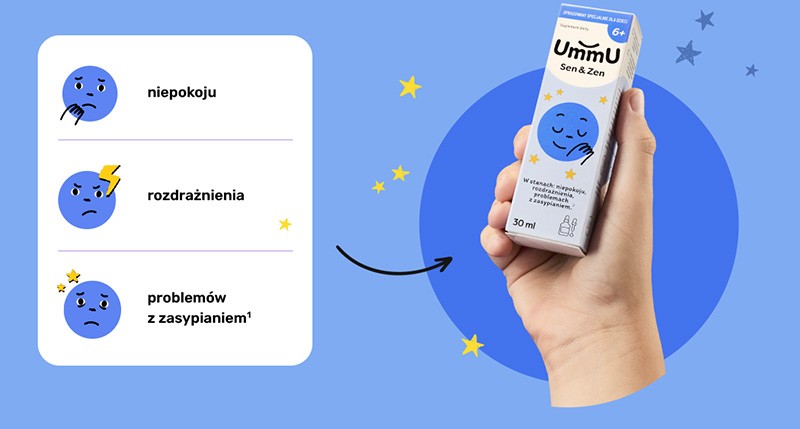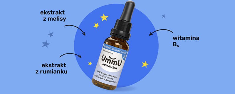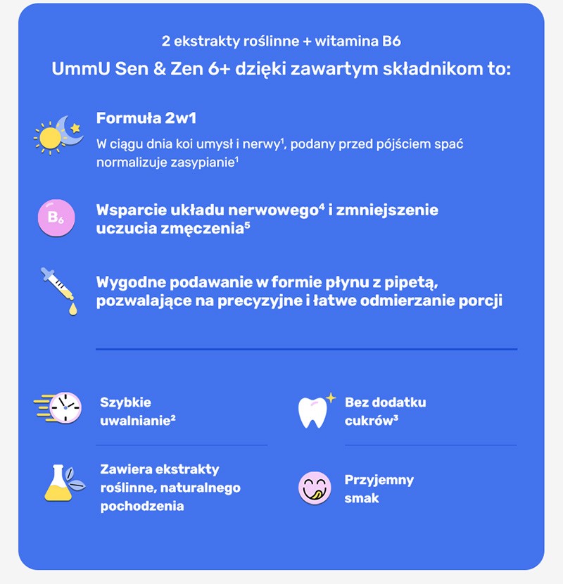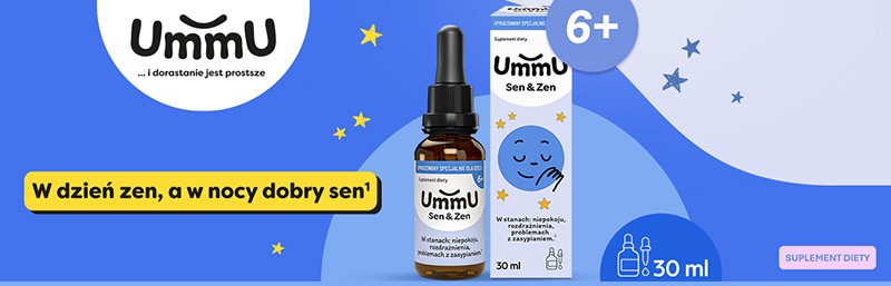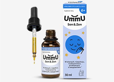 UmmU Sen & Zen 6+ - to suplement diety w postaci płynu o przyjemnym smaku, który zawiera witaminę B6 oraz ekstrakty z melisy i rumianku. Produkt przeznaczony dla dzieci powyżej 6. roku życia.
