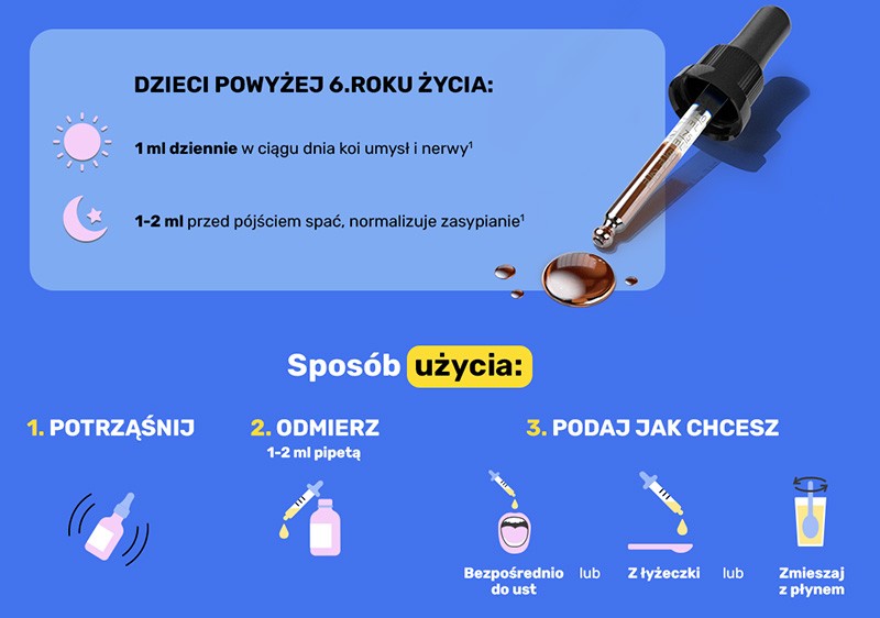 Dzieci powyżej 6. roku życia: 1 ml w ciągu dnia lub 1-2 ml na noc, przed pójściem spać.