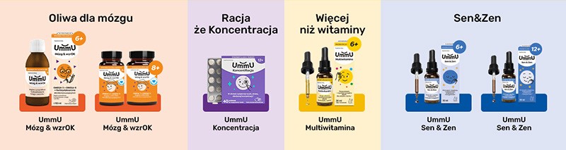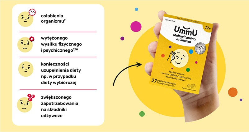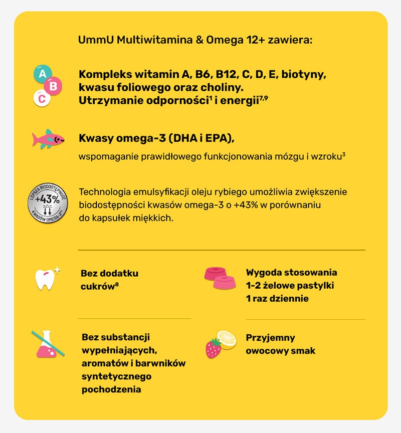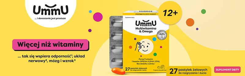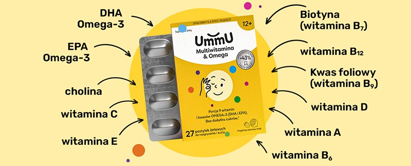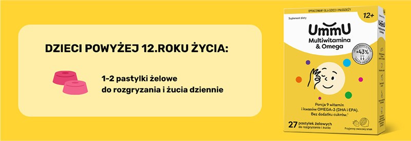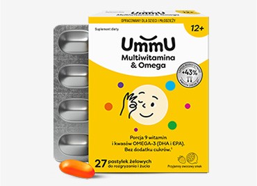 UmmU Multiwitamina&Omega 12+ - to suplement diety w postaci pastylek żelowych, który zawiera zestaw 9 witamin oraz kwasy omega-3. Produkt przeznaczony dla dzieci powyżej 12. roku życia.