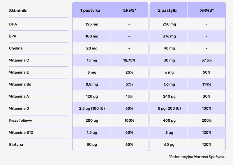 biotynę, kwas foliowy, kwasy omega-3 (DHA, EPA) oraz cholinę.