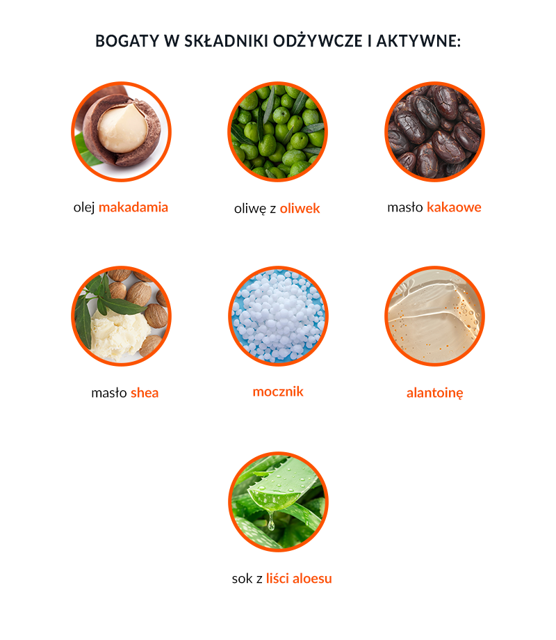 Składniki aktywne: olej makadamia, oliwa z oliwek, masło kakaowe, masło shea, alantoina, mocznik, sok z liści aloesu.