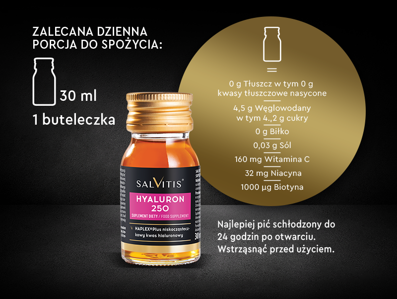 Salvitis Hyaluron 250 - to suplement diety w postaci płynu, który zawiera kwas hialuronowy HAPLEX®, witaminę C, niacynę i biotynę. Produkt przeznaczony dla osób dorosłych.