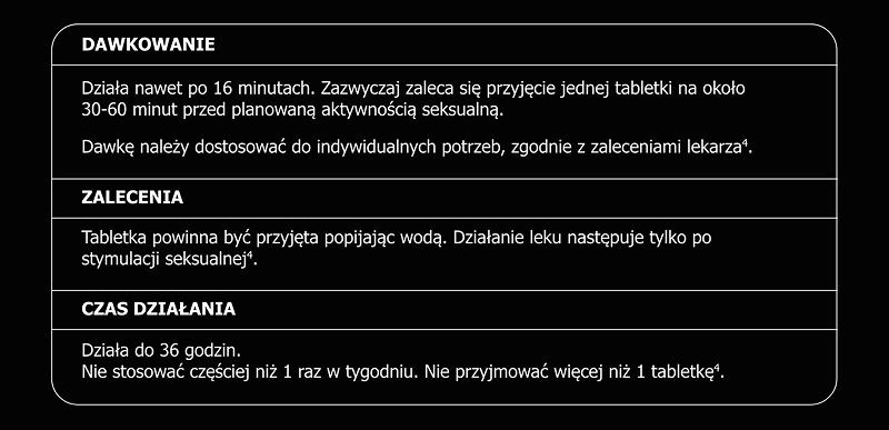 Lek stosuje się doraźnie, w miarę potrzeb. Nie należy stosować częściej niż raz w tygodniu i nie wolno przyjmować więcej niż jednej tabletki.