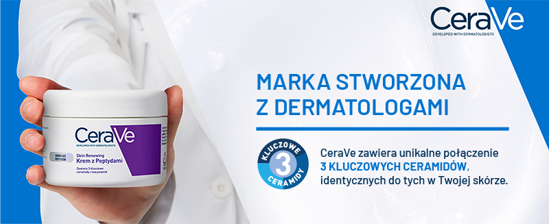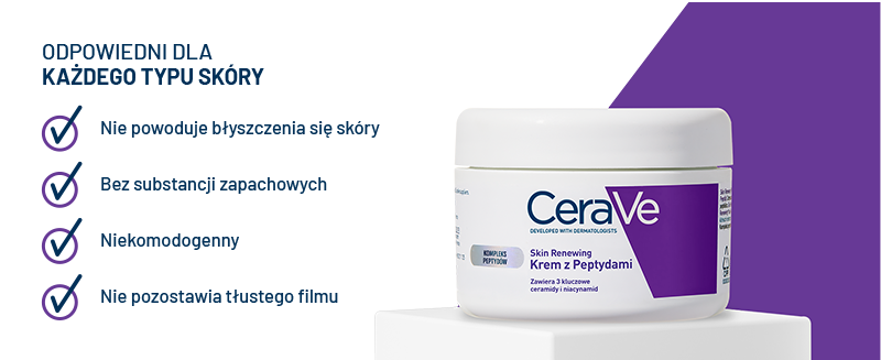 Odkryj sekret jędrnej, sprężystej i zrewitalizowanej skóry z CeraVe Skin Renewing Kremem z Peptydami. Ta bogata formuła została opracowana we współpracy z dermatologami, aby działać wielopoziomowo – intensywnie nawilża, widocznie ujędrnia oraz wspiera regenerację bariery ochronnej skóry. Dzięki kompleksowi peptydów krem skutecznie zmniejsza widoczność drobnych linii, a także zmarszczek już w 2 tygodnie, a skóra staje się bardziej miękka, gładka i elastyczna. Zawarte w formule 3 kluczowe ceramidy oraz niacynamid odbudowują, a także wzmacniają naturalną barierę hydrolipidową, a technologia MVE zapewnia stopniowe uwalnianie składników aktywnych przez cały dzień. Bogata, ale szybko wchłaniająca się konsystencja nie zatyka porów, nie pozostawia tłustego filmu i sprawia, że pielęgnacja staje się czystą przyjemnością.