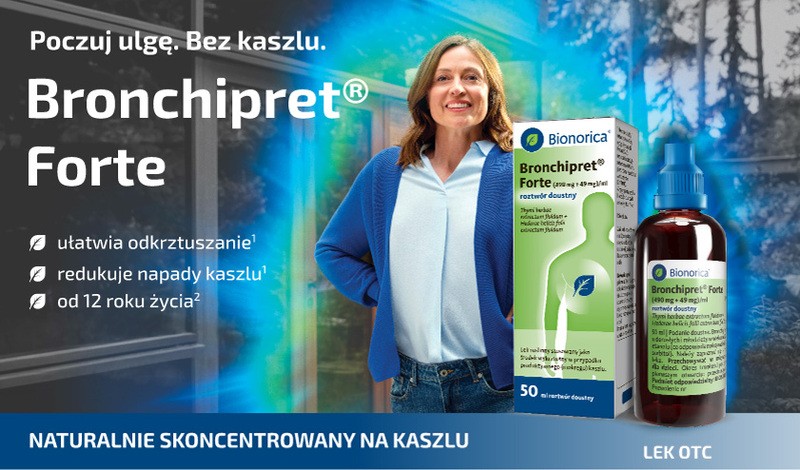 Bronchipret® Forte, roztwór doustny, (490 mg + 49 mg)/ml; 1 ml roztworu zawiera: 490 mg wyciągu płynnego z Thymus vulgaris L. i(lub) Thymus zygis L., herba lub ich mieszanina (ziele tymianku) 1:2‑2,5). Rozpuszczalnik ekstrakcyjny: roztwór amoniaku 10% m/m / glicerol 85% m/m / etanol 90% v/v / woda oczyszczona (1/20/70/109). 49 mg wyciągu płynnego z Hedera helix L., folium (liść bluszczu) (1:1). Rozpuszczalnik ekstrakcyjny: etanol 70% v/v. Postać farmaceutyczna: roztwór doustny. Wskazanie do stosowania: Produkt leczniczy roślinny stosowany jako środek wykrztuśny w przypadku produktywnego kaszlu. Podmiotu odpowiedzialny: Bionorica SE, 92308 Neumarkt, Niemcy. Informacji o leku udziela: Bionorica Polska Sp. z o.o., ul. Hrubieszowska 6B, 01‑209 Warszawa