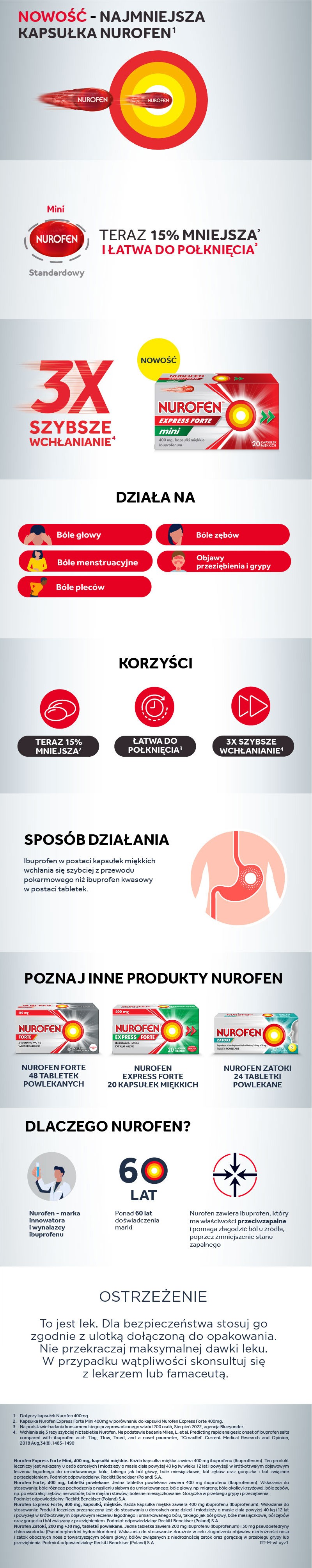 Nurofen Express Forte Mini to lek przeciwbólowy i przeciwzapalny należący do grupy niesteroidowych leków przeciwzapalnych (NLPZ). Zawiera ibuprofen, który działa przeciwbólowo, przeciwgorączkowo i przeciwzapalnie. Preparat szybko się wchłania dzięki miękkiej kapsułce, co pozwala na szybsze działanie w łagodzeniu bólu i gorączki.